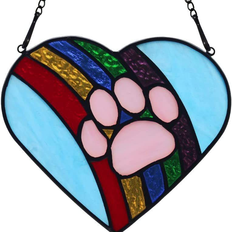 The Rainbow Bridge Suncatcher is a touching tribute to the pets who have crossed the Rainbow Bridge but remain forever in our hearts. Shaped like a heart, this beautifully crafted suncatcher features a rainbow bridge stretching across the center, set against a serene blue sky background. A delicate pink paw print sits atop the rainbow, symbolizing the everlasting bond between you and your beloved pet. As sunlight passes through, it fills your space with warmth and colorful reflections, serving as a gentle reminder that love never fades. Perfect for hanging in a window, garden, or any special place, this suncatcher brings comfort, peace, and a loving connection to those we hold dear.ort, happiness, and the enduring spirit of your cherished pup into your home.